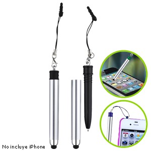 Bolígrafo «Touch-Screen» con tapa plateada y goma posterior negra para pantalla táctil. Incluye práctico soporte plástico para insertar en la salida de auricular del iPhone. Escritura azul.